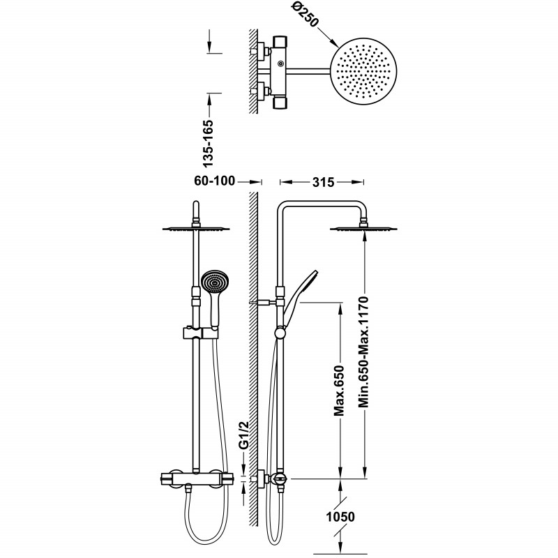 - Незнімний душ Ø 250 мм з шарніром. Матеріал нержавіюча сталь