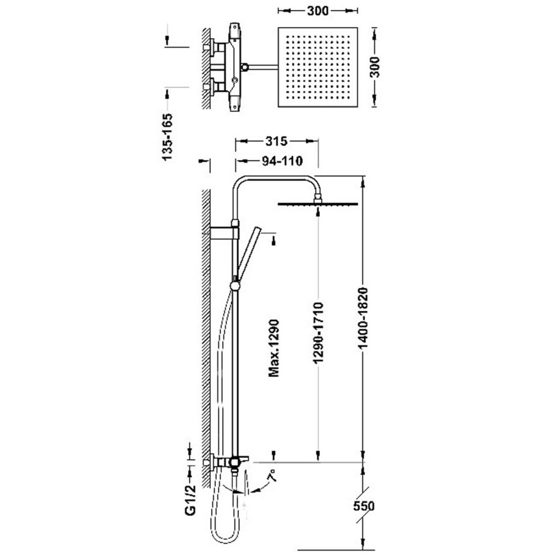- Регульована душова лійка з нержавіючої сталі: 300х300 мм