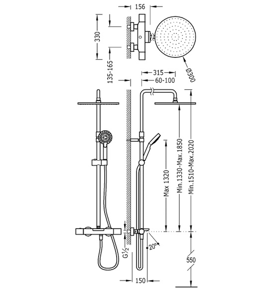 - Незнімний душ Ø 300 мм мм з шарніром. Латунь.