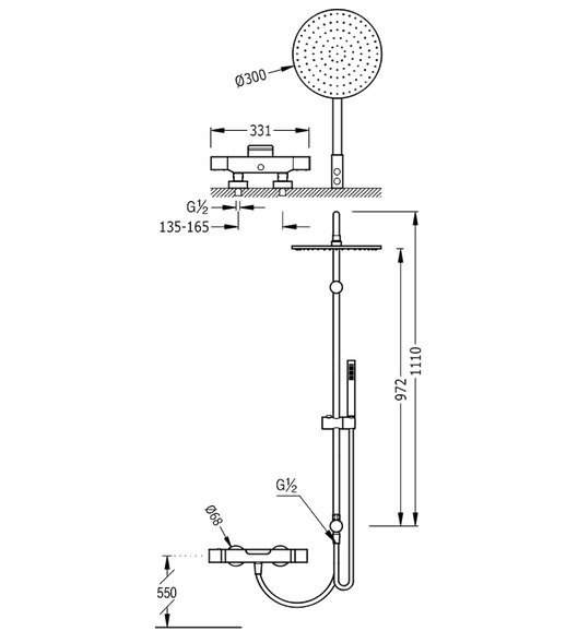 - Незнімний душ Ø 300 мм з шарніром з латуні
