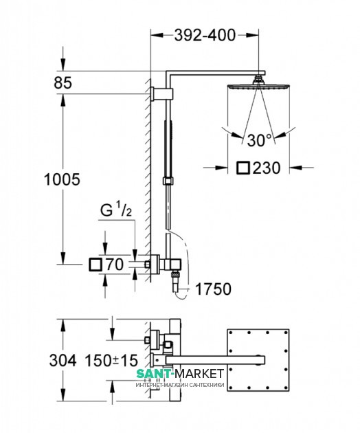 - Euphoria Cube XXL System 230 Душова система з термостатом для настінного монтажу