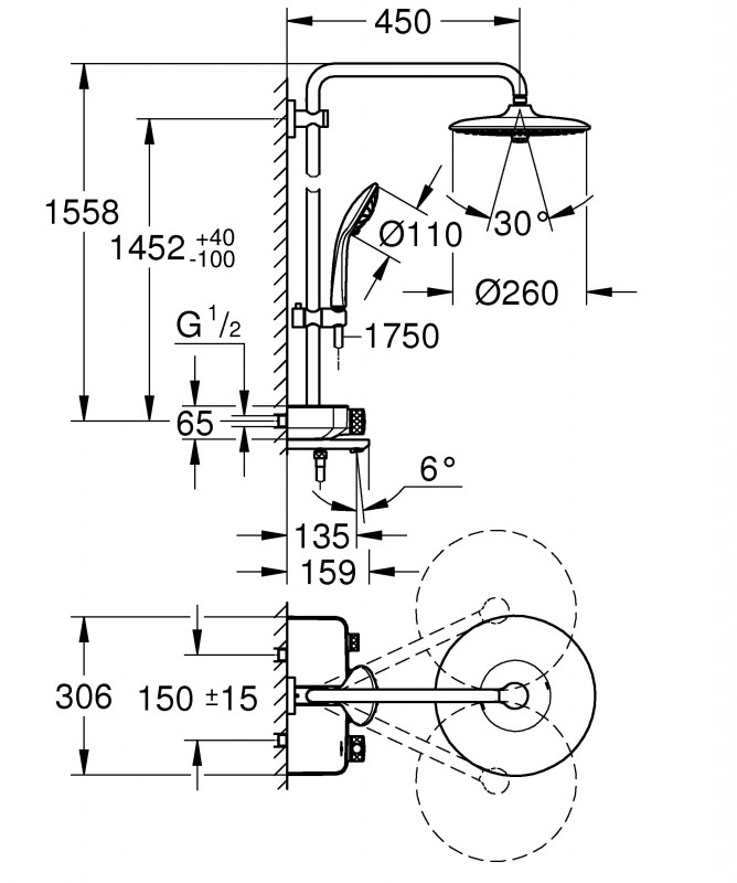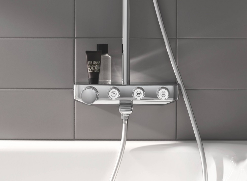Плавне, чуйне управління, зрозумілі функції та бездоганний стиль забезпечать розкішний досвід прийняття душу. Інноваційна технологія GROHE SmartControl дозволяє перемикатися між режимами струменя та комбінувати потоки верхнього та ручного душу, так само як і регулювати натиск води за допомогою простого натискання та повороту кнопки. Технологія EcoJoy дозволяє скоротити витрати води. Верхній душ діаметром 260 мм має три душові зони: м'який та обволікаючий режим Rain, стимулюючий, економічний режим SmartRain і потужний, що відновлює Jet. У ручному душі діаметром 110 мм - три режими струменя: ніжний Rain, водозберігаючий SmartRain івідновлюючий Massage. Технологія GROHE DreamSpray гарантує, що з кожної форсунки йтиме однаковий напір води. Силіконові форсунки SpeedClean спроектовані так, щоб їх можна було легко очистити від вапняних відкладень. Технологія GROHE TurboStat забезпечує постійну температуру води з вашого душу. GROHE SafeStop дозволяє встановити максимальну температуру на 38˚C, а SafeStop Plus пропонує збільшити обмеження температури до 43˚C. Для додаткової безпеки технологія GROHE CoolTouch гарантує, що корпус термостата не буде надто гарячим для дотику. Полочка EasyReach додасть у ваш душ практичності, адже шампунь та мило завжди будуть у вас під рукою. Надійна та сліпуча хромова поверхня GROHE StarLightзбереже свій чудовий зовнішній вигляд на довгі роки. Завдяки системі GROHE QuickFix установка системи буде простою та швидкою, адже кронштейн можна встановити у вже існуючі отвори в стіні.