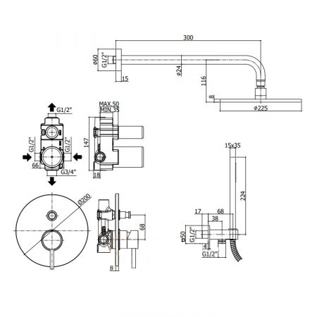 LIGHT Змішувач для душу з перемикачем на 2 споживача, в комплекті з внутрішньою частиною, колір - хром + Верхній душ круглий, Ø225 мм, колір - хром + Тримач верхнього душа зі стіни 350мм, колір - хром + Ручний душ з тримачем, шлангом 1500мм і випуском зі стіни, колір - хром