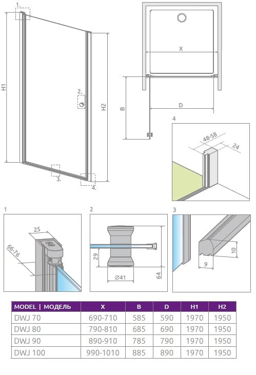 Radaway Eos DWJ - одностулкова двері в нішу. Дана душова двері представлена в розмірах 70, 80, 90 см і має універсальне виконання. Колекція Eos дуже популярна через свою практичності. Широкий модельний радий і доступна ціна це основні плюси цієї колекції. У душових кабінах Eos двері відкриваються як назовні, так і всередину. Крім моделей зі звичайною орної дверима, є кабіни зі складаним дверима (bifold) і двостулковими дверима. Всі моделі можливо встановити як на піддоні, так і безпосередньо на підлогу. Всі моделі можливо встановити без планки порога. В такому випадку нижній горизонтальний ущільнювач буде розміром вище.