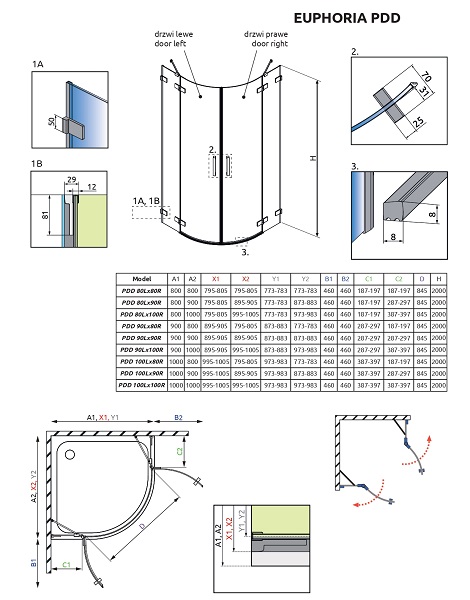 КолекціяEuphoria це набір душових кабін і дверей в нішу з орними дверима, які відчиняються назовні. Все в стилі мінімалізму. Пристінний профіль відсутня, в місце нього пристінні кронштейни. Кабіни серії Euphoria допускається встановлювати як на піддони, так і безпосередньо на підлогу. Всі моделі можна замовити за індивідуальними розмірами.