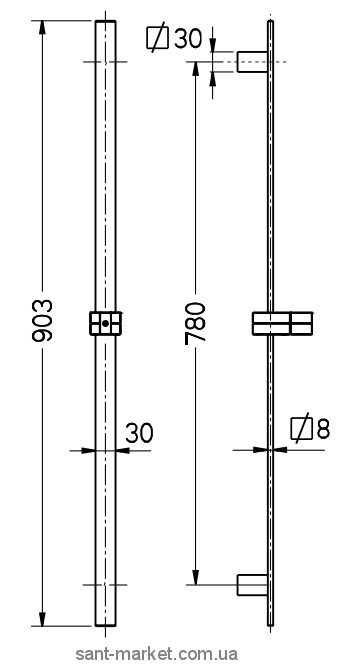 Конструкція цієї моделі включає оригінальну плоску штангу шириною 3 сантиметри і товщиною 8 міліметрів, яка піднімається на 90,3 сантиметра вгору. З протилежних кінців, на відстані 78 сантиметрів один від одного цю напрямну штангу кріплять до стіни два елементи у формі прямокутних паралелограмів з квадратним перетином стороною 3 сантиметри. Точно посередині між кріпленнями розташований плоский тримач для душу, куди встановлюється ручний душ сучасної форми, що входить до комплекту: плоска ручка середньої довжини, злегка зігнута в останній третині забезпечена в цій частині з нижньої сторони декількома рядами квадратних отворів для подачі води.