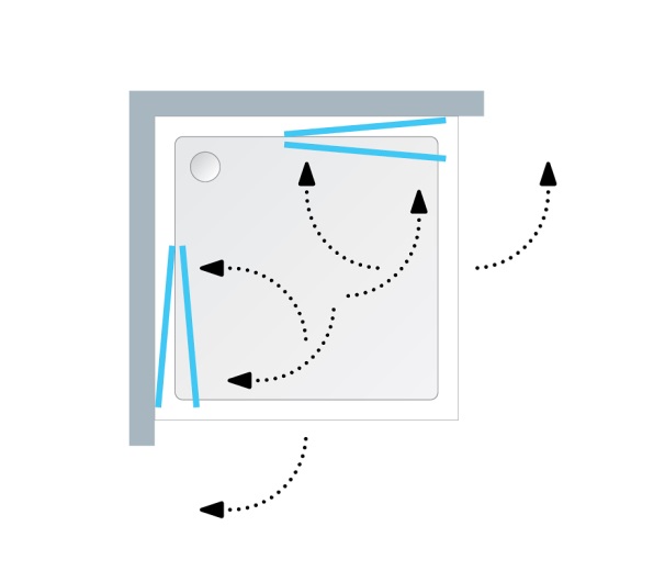 Хромовані петлі з функцією відкриття всередину або назовні +/-90. Підходить для невеликих ванних кімнат, де повне відкривання всередину дає додатковий простір (в разі, якщо душова кабіна встановлена на низький піддон).