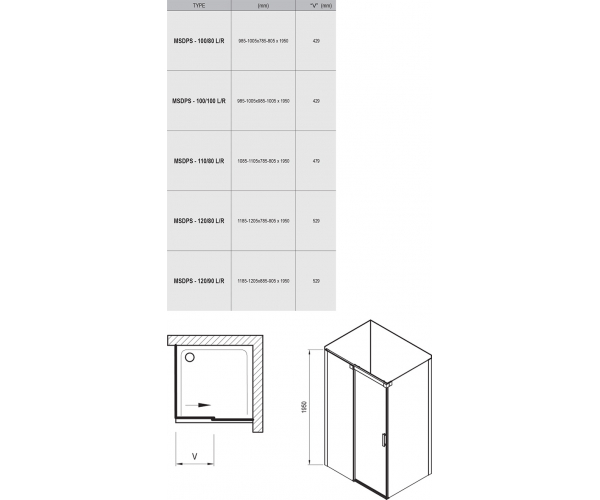 Вирібскладається з двоелементний душових дверей (одна нерухома частина і одна рухома частина, що утворює розсувні двері) і одноелементної нерухомої стінки. Лівий або правий варіанти відкривання дверей визначаються тим, на якій стороні, побачивши зовні, знаходяться петлі. Встановлюється в облицьований кахлем кут ванної кімнати на піддони Perseus Pro Chrome, Gigant Pro Chrome або безпосередньо на підлогу з вбудованим душовим каналом або трапом.