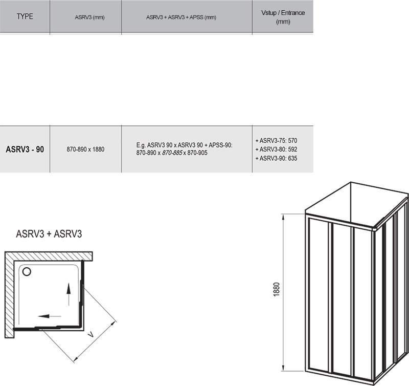 Виріб поставляється в зібраному вигляді, необхідно лише прикріпити його до стіни і ущільнити. За допомогою комбінації різних розмірів вироби SRV2-S можна отримати квадратний або прямокутний варіанти душового простору. Колекція надає найширший вхід з усіх прямокутних душових куточків Supernova. За допомогою комбінації різних розмірів вироби ASRV3 можна отриматиквадратний або прямокутний варіанти душового простору.
