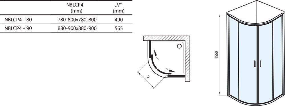 Продукт складається з двох рівних фіксованих частин та двох вигнутих частин, що утворюють розсувні двері. Кут ванної кімнати встановлюється в плитці на піддонах Равак Ронда, Еліпсо, Еліпсо Про, Elipso Pro Flat, Elipso Pro Chrome або безпосередньо на підлогу відПобудований -в душовому каналі або драбині.