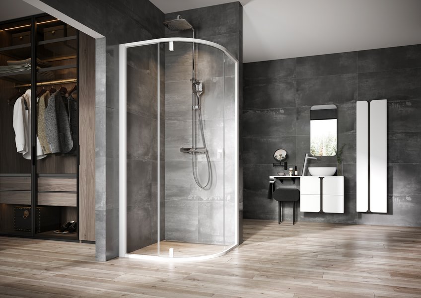 Виріб складається з двох рівних нерухомих частин та однієї вигнутої частини, що утворює двері поворотного типу.Повернувши виріб на 180° вийде лівий/правий варіант відчинення дверей. Встановлюється в облицьований кахлем кут ванної кімнати на піддони RAVAK Ronda, Elipso Pro, Elipso Pro, Elipso Pro Chrome або безпосередньо на підлогу з вбудованим душовим каналом або трапом.