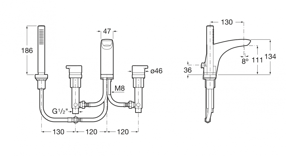 Змішувач на борт ванни Roca Insignia. Повний комплект (зовнішня частина + прихована частина).