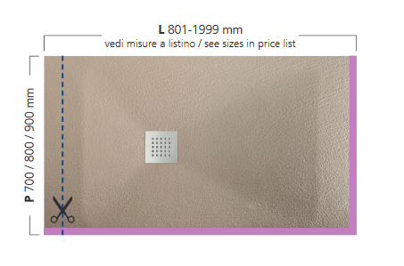 Душовий піддон Hatria Dedicato Edge L 1501-1599x1000 мм LT для установки в лівий кут, легко обрізається під ваш розмір по довжині, відстань від краю до зливного отвору 550 мм. З L-образної кромкою (H 1 см x L 5 см) з 2 сторін, в тій же обробці, що і піддон. Тільки 3 см у висоту, легко ріжеться, 7 різних кольорів (фото).