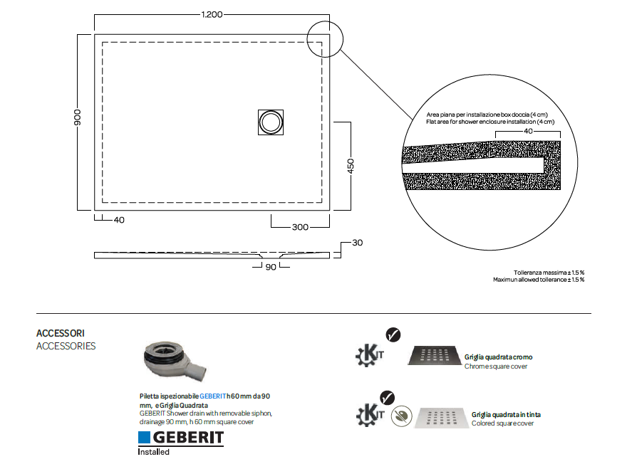 Душовий піддон Hatria Petra H3 Levigato 120x90 см з сифоном керамика цемент PL12009000700