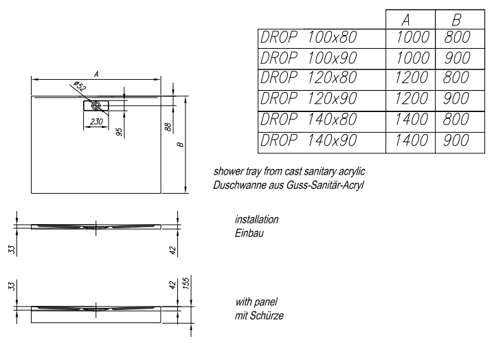 Чіткі лінії душового піддону Drop, виконані з литого санітарного акрилу, представлені у квадратній або прямокутній формі, надають широкий вибір розмірів для естетичної та архітектурної відповідності Вашим потребам.