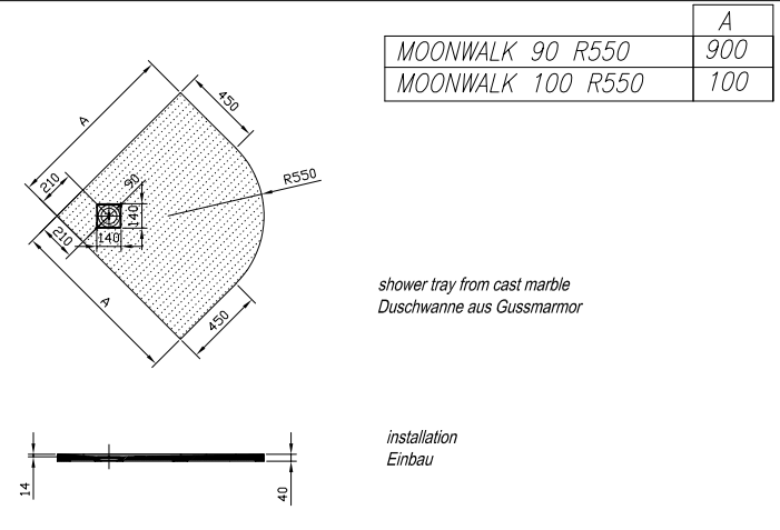 Напівкруглий душовий піддон Moonwalk з литого мармуру з рельєфною поверхнею в темному або світлому відтінку справжньої елегантності.