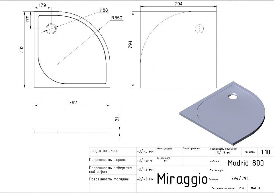 1) Душовий піддон Miraggio Madrid 800 білий глянцевий