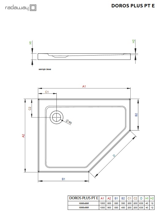 1) Душовий піддон Radaway Doros Plus PT E 100х80 правобічний акрил білий