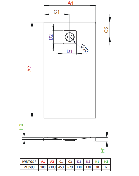 Низький піддон Kyntos F 210x90 см із ливарного каменю для монтажу безпосередньо на підлогу. Отвір під сифон Ø 90 мм, рекомендований сифон HS1.