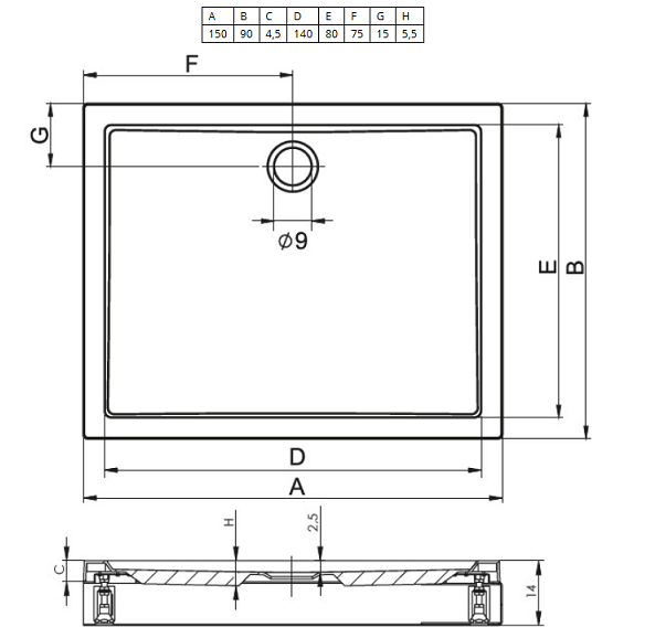 1) Душовий піддон Riho Davos 265 150х90 см акрил білий