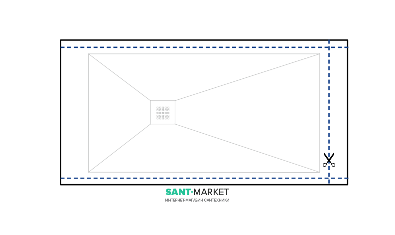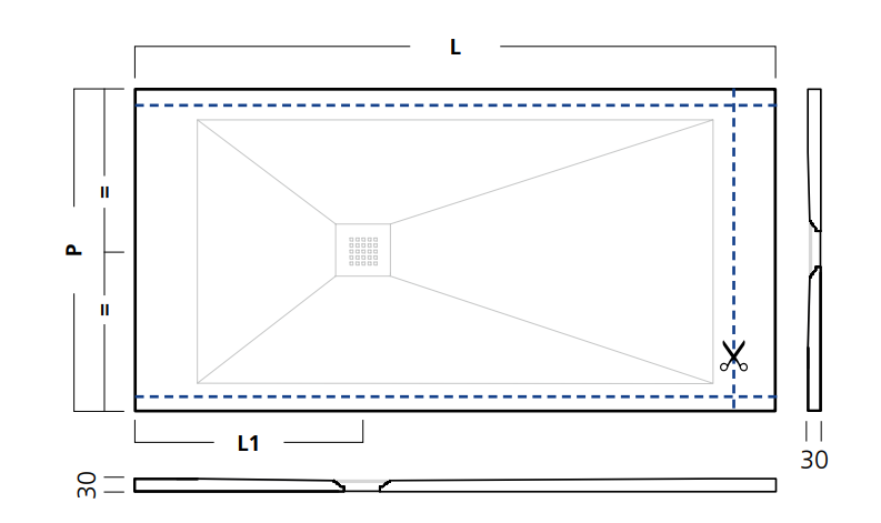 Душовий піддон Hatria Dedicato 1001-1099x700 мм обертається, легко обрізається під ваш розмір по довжині, відстань від краю до зливного отвору 350 мм. Тільки 3 см у висоту, легко ріжеться, 6 різних кольорів на вибір (фото).