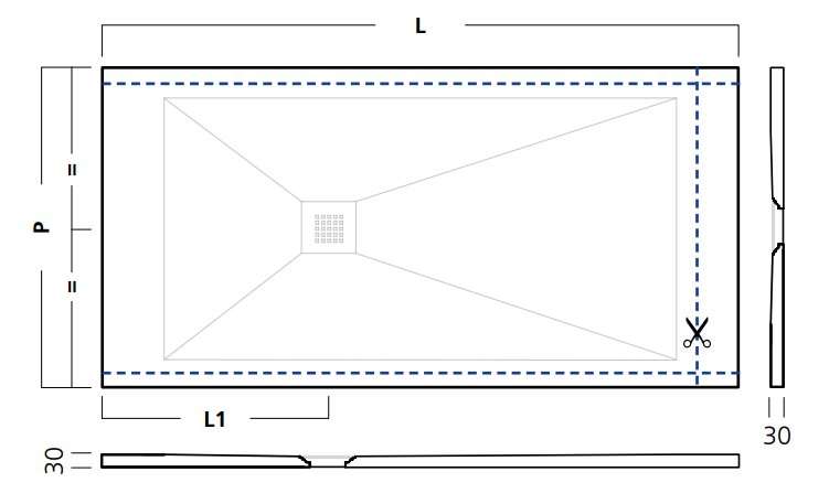 Душовий піддон Hatria Dedicato 1201-1299x75-79.9 мм універсальної установки, легко обрізається під ваш розмір по довжині і ширині, відстань від краю до зливного отвору 350 мм. Тільки 3 см у висоту, легко ріжеться, 6 різних кольорів (фото).