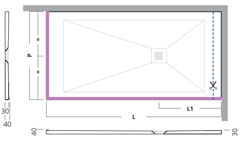 Душовий піддон Hatria Dedicato Edge L 1001-1099x700 мм RH для установки в правий кут, легко обрізається під ваш розмір по довжині, відстань від краю до зливного отвору 350 мм. З L-образної кромкою (H 1 см x L 5 см) з 2 сторін, в тій же обробці, що і поддон.Только 3 см у висоту, легко ріжеться, 6 різних кольорів (фото).