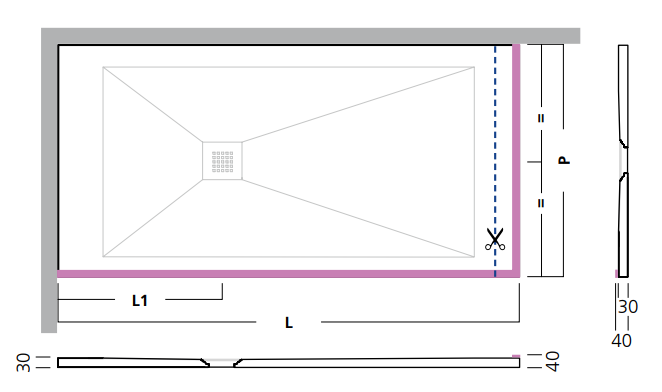 Душовий піддон Hatria Dedicato Edge L 1001-1099x900 мм LT для установки в лівий кут, легко обрізається під ваш розмір по довжині, відстань від краю до зливного отвору 350 мм. З L-образної кромкою (H 1 см x L 5 см) з 2 сторін, в тій же обробці, що і піддон. Тільки 3 см у висоту, легко ріжеться, 6 різних кольорів (фото).