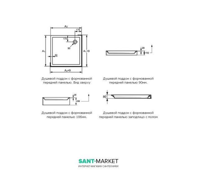 Душовий піддон Huppe Verano 90х90 без передньої панелі білий 235001.055