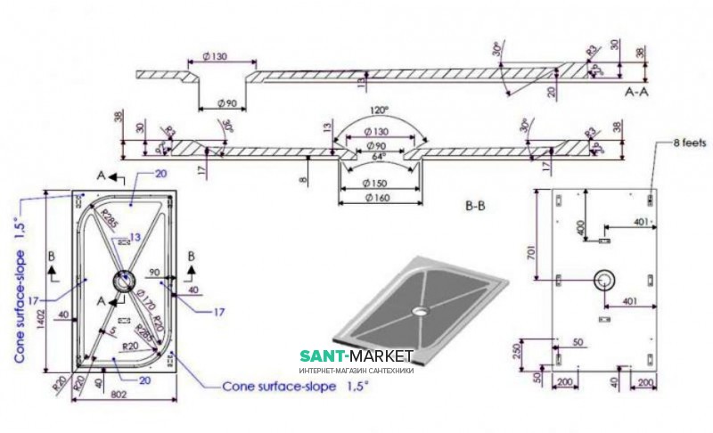 Душовий піддон литий мармур прямокутний MARMITE 140х80х3 білий 01161143003