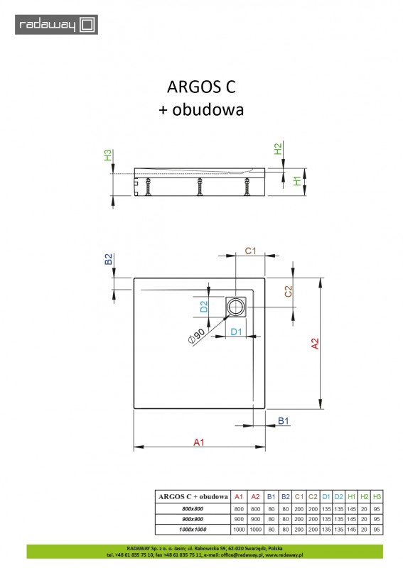 1) Душовий піддон Radaway Argos C 100x100 см на ніжках акрил б лий
