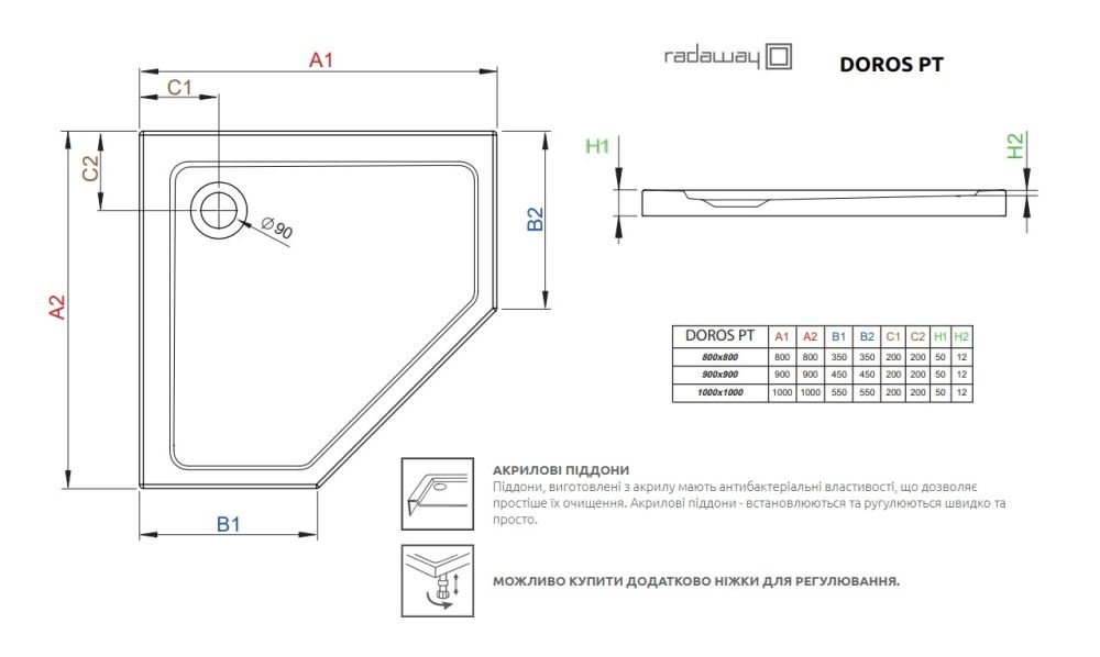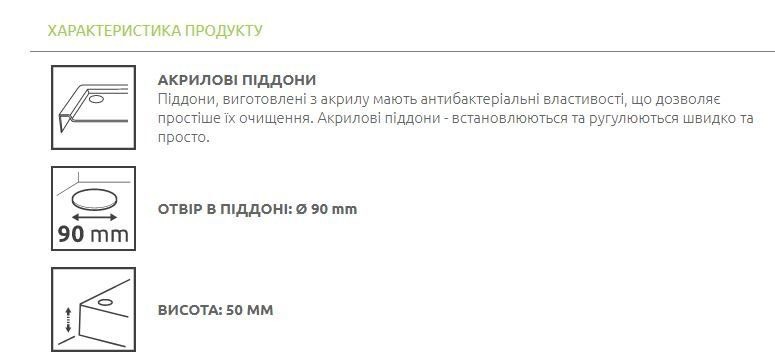 Перевагою піддонів з акрилу є антибактеріальні властивості поверхні а також легке очищення. Акрилові піддони монтується і регулюється швидко і просто.