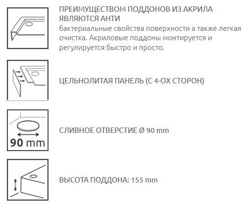 Перевагою піддонів з акрилу є антибактеріальні властивості поверхні а також легке очищення. Акрилові піддони монтується і регулюється швидко і просто.