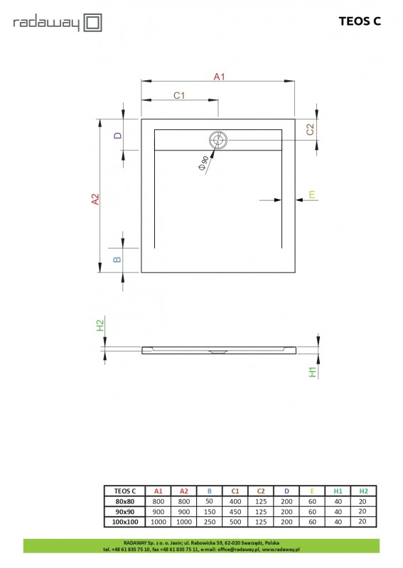 Душовий піддон Radaway Teos C з литого каменю, для монтажу безпосередньо на підлогу, можливо вбудовування в підлогуврівень з рівнем плитки. Стійкість до вологи і цвілі. Антибактеріальна і антиковзаюча поверхню. Матеріал піддону підлягає реставрації.