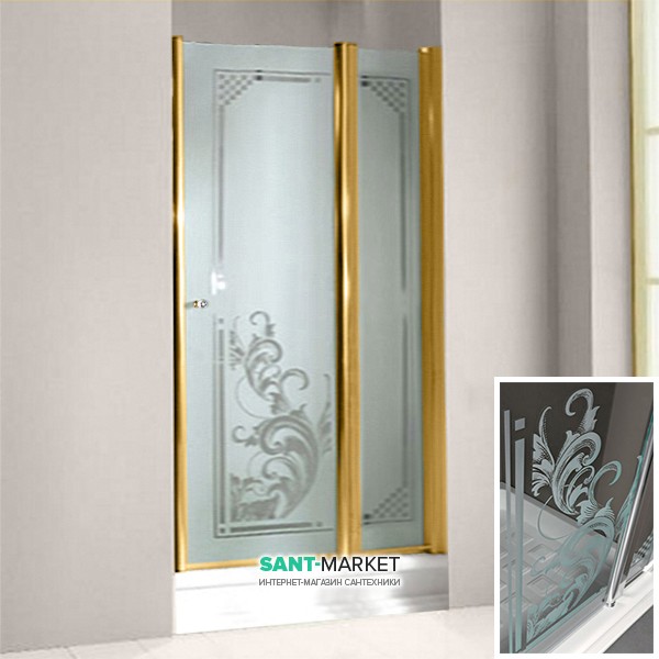 Двері SX в нішу орні Kerasan Retro, ліва / прозоре з матовим малюнком / золото - лівостороння двері з нерухомою панеллю. Колір профілю та фурнітури золотий, ручка кристал.
