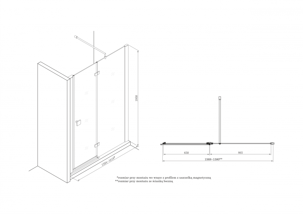 1) Двері душова орні Roca Metropolis 160х195 профіль алюміній хром прозоре скло