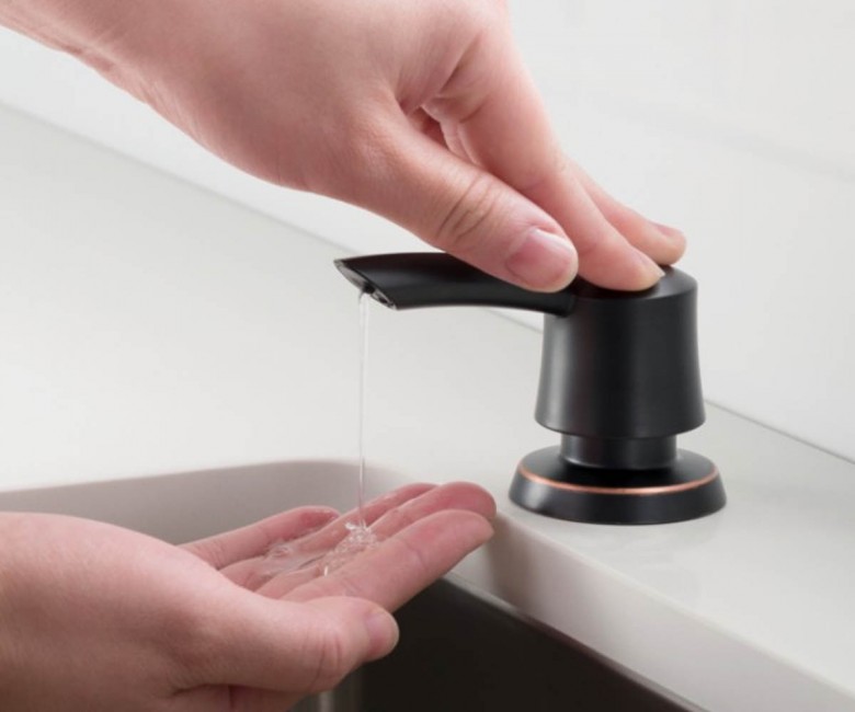 Дозатор для миючого засобу з легким натисканням ідеально підходить для кухонного змішувача, для подачі мила на губку або безпосередньо в раковину. Пляшка великої місткості вміщує 414 мл рідкого мила, лосьйону або рідкого миючого засобу. Заправка зверху для максимальної зручності. Різьбове з'єднання полегшує установку завдяки герметичному водонепроникному ущільнення над і під стійкою для захисту від протікання. Насос обертається на 360 °, тому ви можете розташувати форсунку там, де вам потрібно. Поставляється на вибір з п'яти покриттів, щоб відповідати будь-якому кухонного крану.