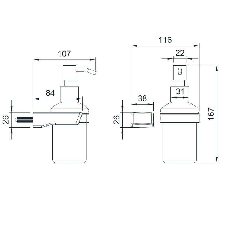 Тримач і механізм дозатора виконані з високоякісного металу з покриттям кольору нікель, а ємність з матового скла має обсяг 300 мл.
