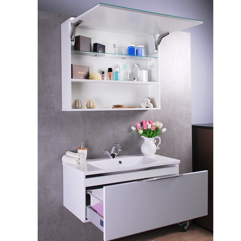 Навісний дзеркальну шафку для ванної з полками. Дверцята відкриваються вгору. Підйомний механізм Free Flap. LED підсвічування з електроспоживання балансується в 10 разів менше, ніж у ламп розжарювання. Корпус виконаний з ДСП, покритої вінілової плівкою стійкою до стирання. Фасадна частина дверки - дзеркало. Під дверцятами відкрита полиця. Меблі від виробника Буль-Буль - відмінне доповнення інтер'єру ванної. Модель може бути виготовлена в інших розмірах.