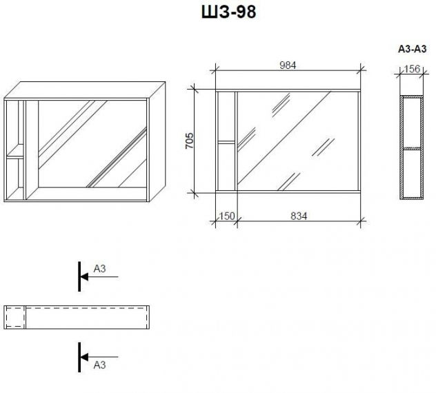 задня дзеркальна стінка, нижня поличка по всій довжині шафки, 2 бічних відкритих полиці з одного боку