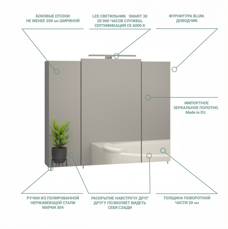 Sanwerk використовує новіматеріали та ідеї, удосконалює конструкцію. Їх дзеркальні галереї тонше, легше і красивіше, ніж у інших виробників. Звертаємо Вашу увагу на той факт, що компанія єдина, хто використовує 12 мм товщину ДСП для дверцят і корпусу. Конкуренти використовують 16 мм, і з цієї причини вони виглядають грубими. Як ручки використовують нержавіючу поліровану сталь (марки 304). Конкуренти використовують оцинкований метал, який можна використовувати у ванній.