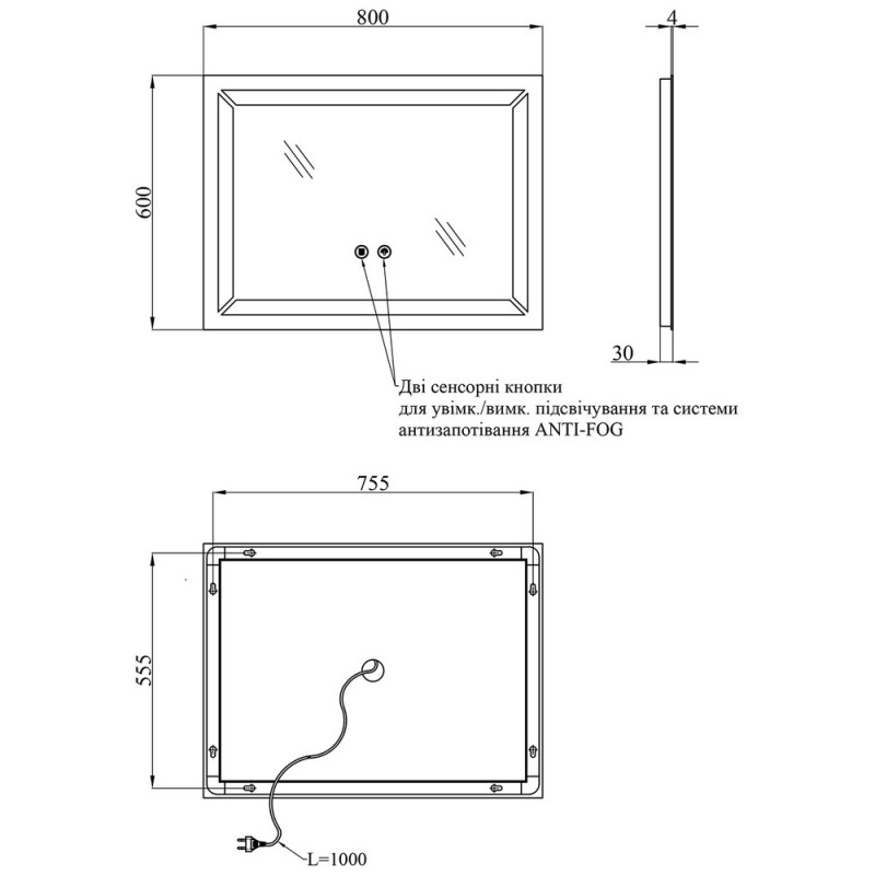 Дзеркало Kroner KRP Spiegel HR1-8060 80х60 см з LED-підсвічуванням та антизапітнінням CV030030