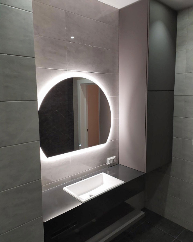 Частина світла направляється на всі боки паралельно поверхні дзеркала, красиво висвітлюючи м'яким світінням стіну навколо вироби. Так званий ефект «амбілайт». Інша частина виходить з світловий кромки шириною 5 мм по всьому периметру вироби, висвітлюючилюдини, який користується дзеркалом. Підсвічування включається за допомогою тач-сенсора. Сенсор торкання (тач-сенсор) у вигляді світиться кнопки розташовується на лицьовій поверхні дзеркала. Підсвічування вмикається і вимикається в момент торкання сенсора рукою.