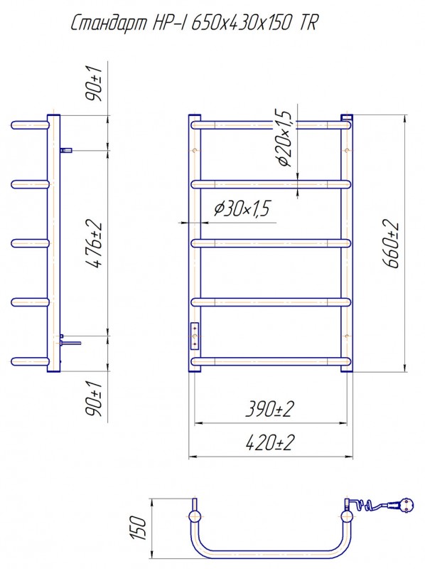 Електричний полотенцесушитель Mario Стандарт HP-I TR 650x430 / 150 праве підключення