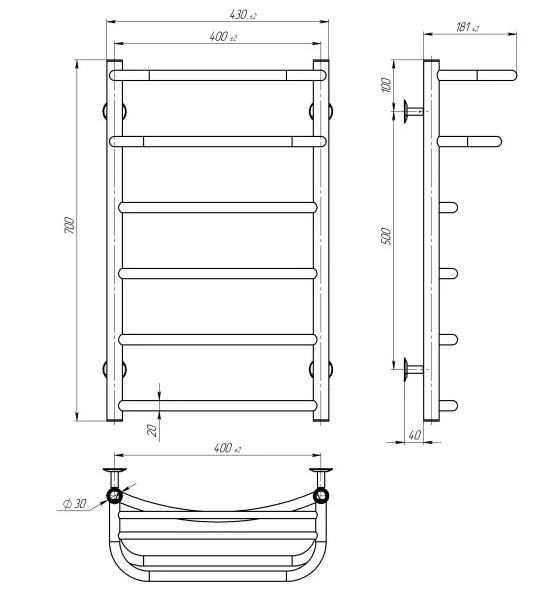 Електрична сушарка для рушників Deffi Готель П6 400х700 праве підключення чорний C.OD.70.40.6.E.B.R.5