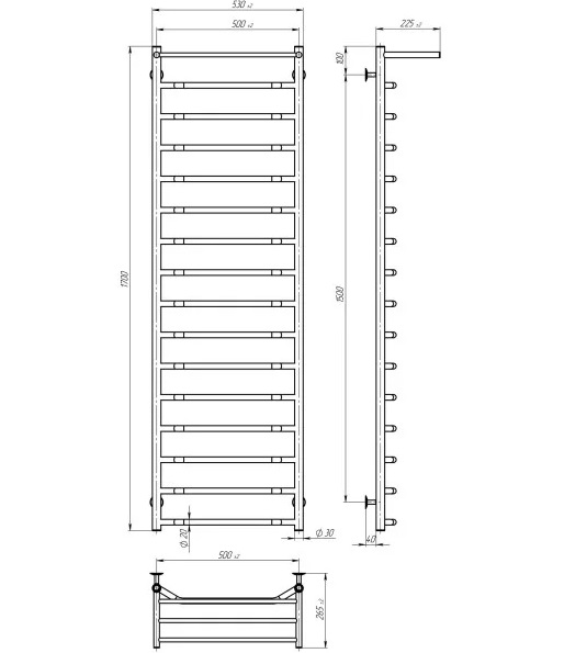 Електрична сушарка для рушників Deffi Трапеція з полицею П16 500х1700 праве підключення білий C.TP.170.50.16.E.W.R.5