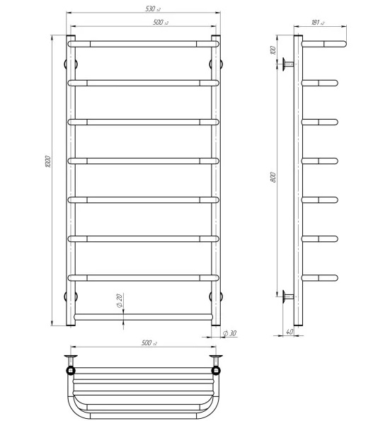 Електрична сушарка для рушників Deffi Стандарт з полицею П8 500х1000 праве підключення JD03 чорний C.SP.100.50.8.E.B.R.1