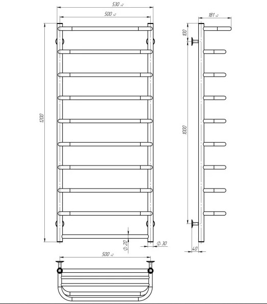 Електрична сушарка для рушників Deffi Стандарт із полицею П10 500х1200 праве підключення JD03 хром C.SP.120.50.10.E.C.R.1