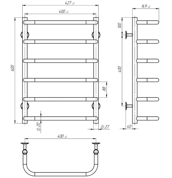 Електрична сушарка для рушників Deffi Стандарт П6 400х600 ліве підключення EF16 чорний D.SS.60.40.6.E.B.L.5
