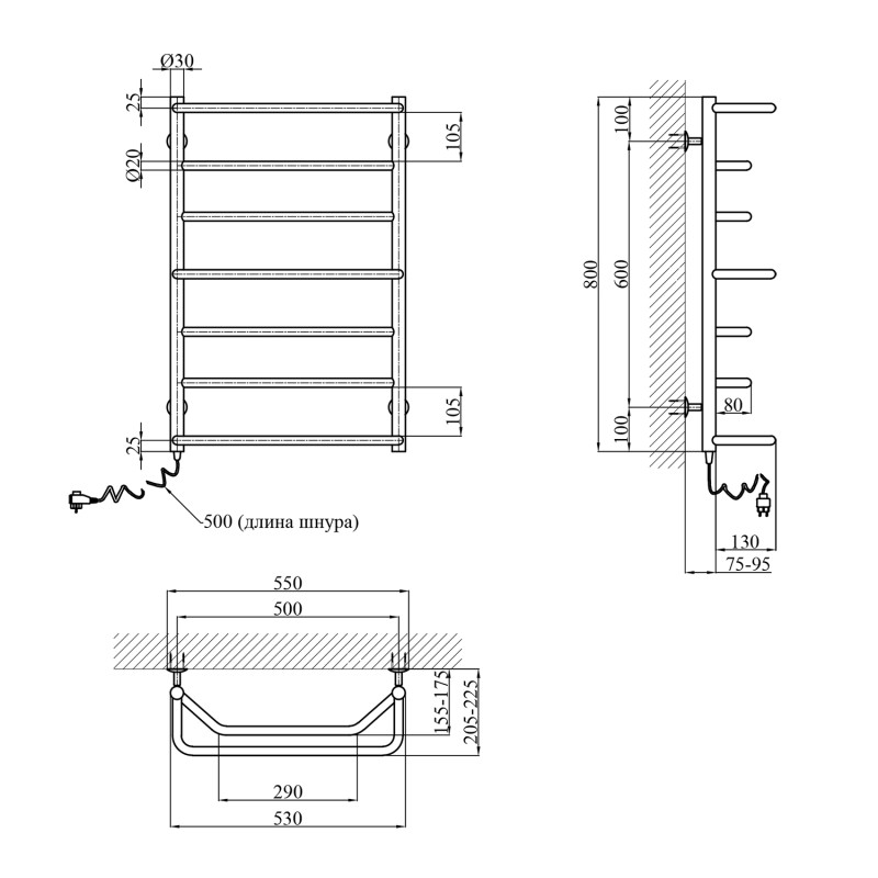 Електрична сушка для рушників Kroner Мікс 800x500/7 (С1-Т2-С1-Т2-С1) ліве підключення хром ДМ07EL